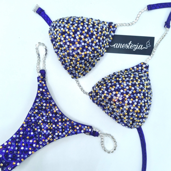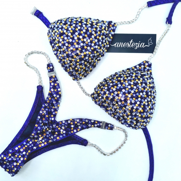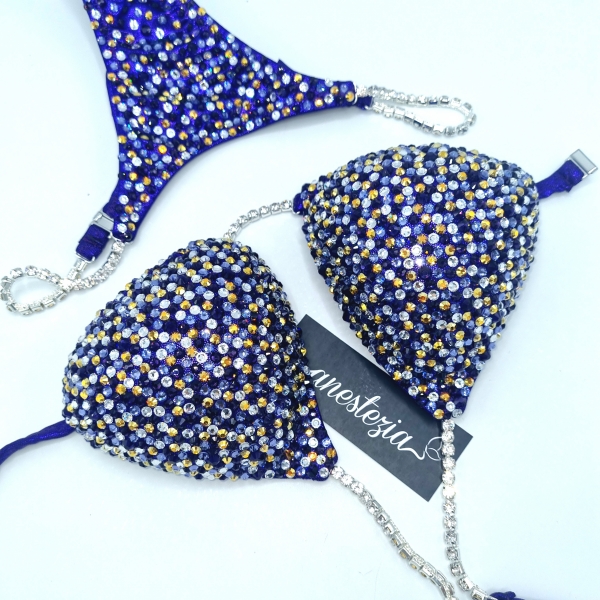 Increíble bikini Golden Eclipse es uno de nuestros nuevos diseños decorado totalmente con cristales. Mix de varios tonos de cristales cubren totalmente la tela. Este bikini es ideal para competidoras de nivel nacional e internacional.