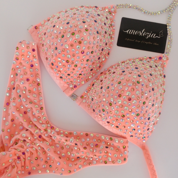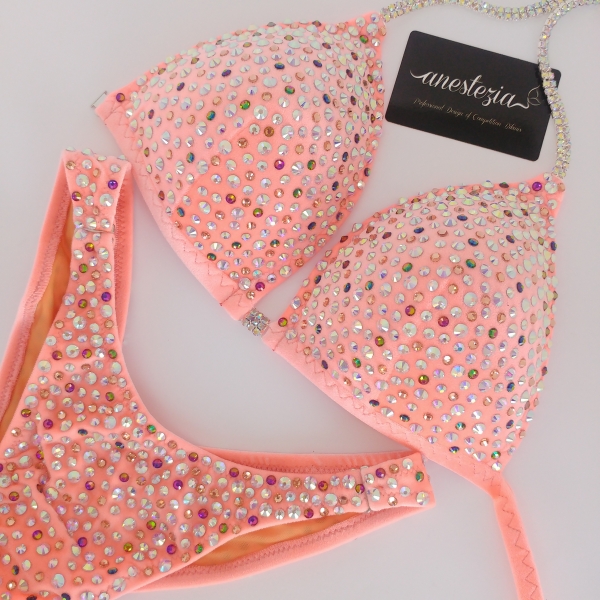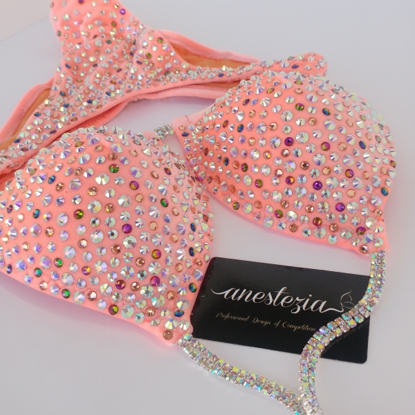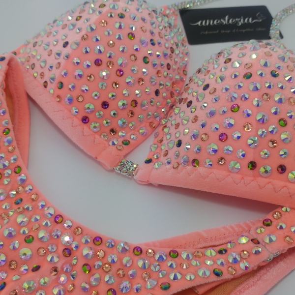 Increible bikini Peach Princess se crea para que brilles como una estrella en el escenario! Hermosa combinación de terciopelo color salmón y cristales de diferentes tonos y medidas hacen que este bikini sea muy especial y atractivo. Luce fantástica con un color oscuro de piel!