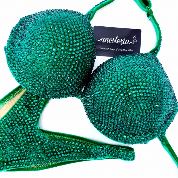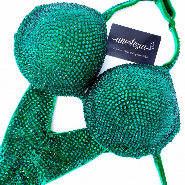 Magnífico bikini fitness Green Pro Queen totalmente cubierto de cristales Te hará brillar increíblemente en el escenario. Muy elegante bikini clásico estilo Pro. Perfecto tanto para atletas con pelo rubio o de pelo oscuro .