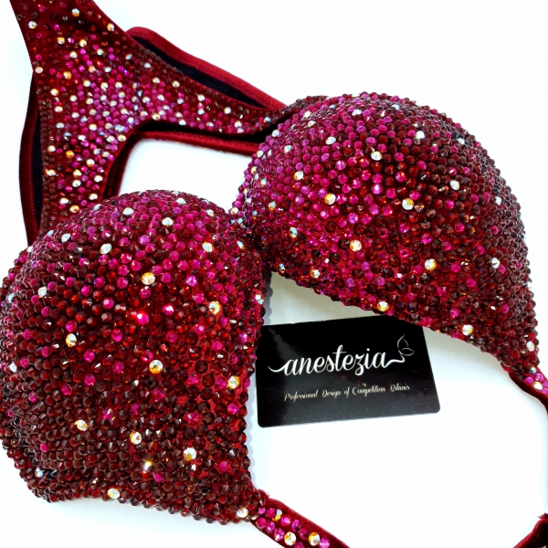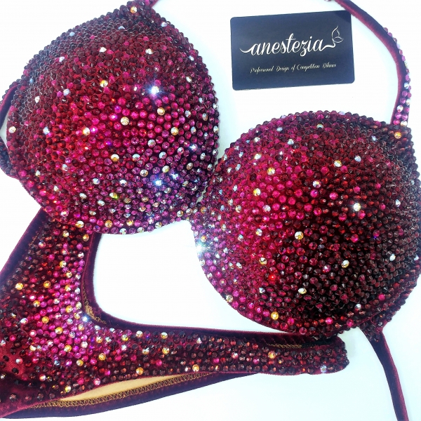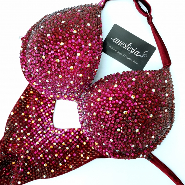 Increíble bikini de Queen of burdeo es uno de nuestros bikinis línea de lujo. Gradual de 5 colores cubren totalmente la tela. Braguita de estilo ruso. Este bikini es ideal para competidoras nivel internacional.