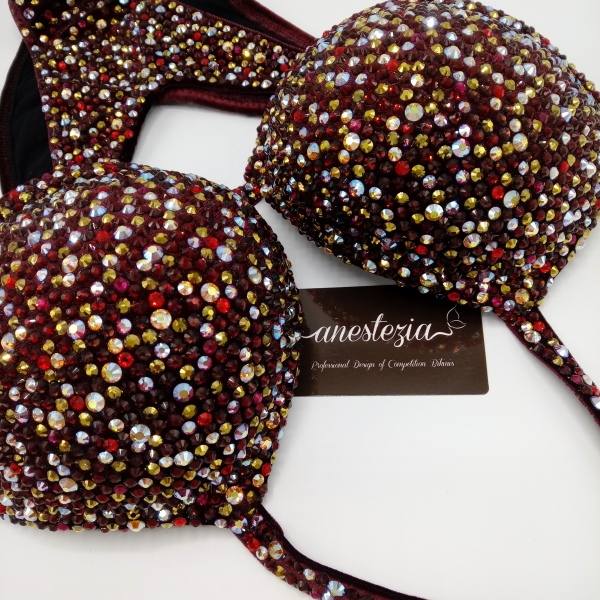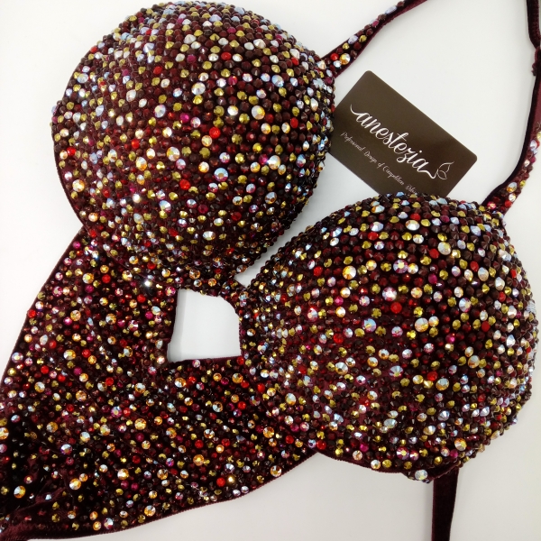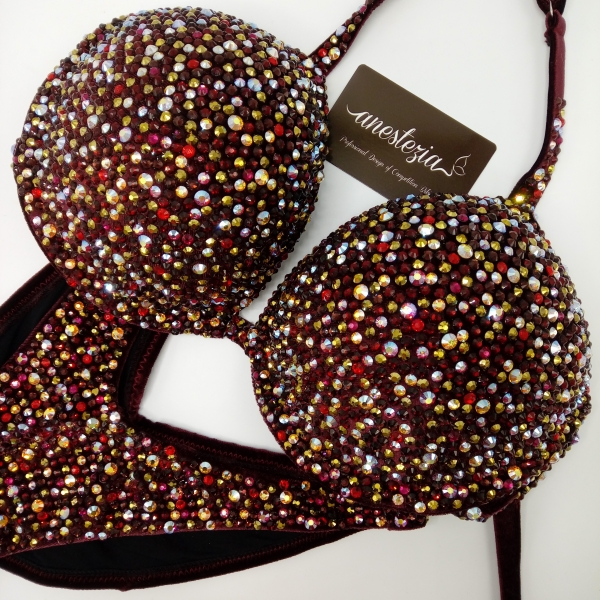 Increíble bikini Imperial Gold es uno de nuestros bikinis línea de lujo. Mix de 6 colores cubren totalmente la tela. Hermosa combinación de cristales rojo oscuro y oro en un elegante terciopelo. Sujetador con aros y braguita de estilo ruso. Este bikini es ideal para competidoras de nivel internacional.