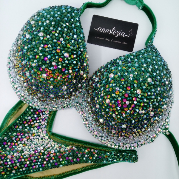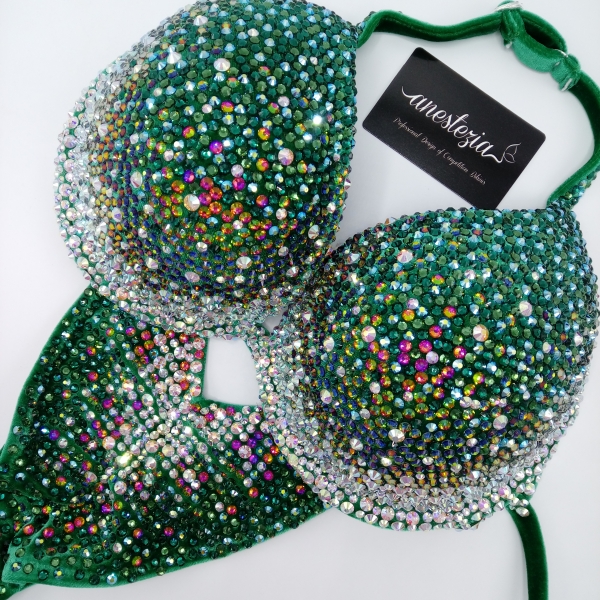 Increíble bikini de Queen of Queens es uno de nuestros nuevos diseños con braguita estilo Ruso. Gradual de 3 brillantes tonos de cristales hacen un hermoso efecto visual en una tela de terciopelo. Braguita de estilo ruso y sujetador copa con aro. Este bikini es ideal para competidoras nivel internacional.