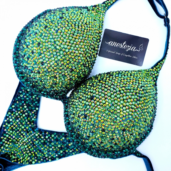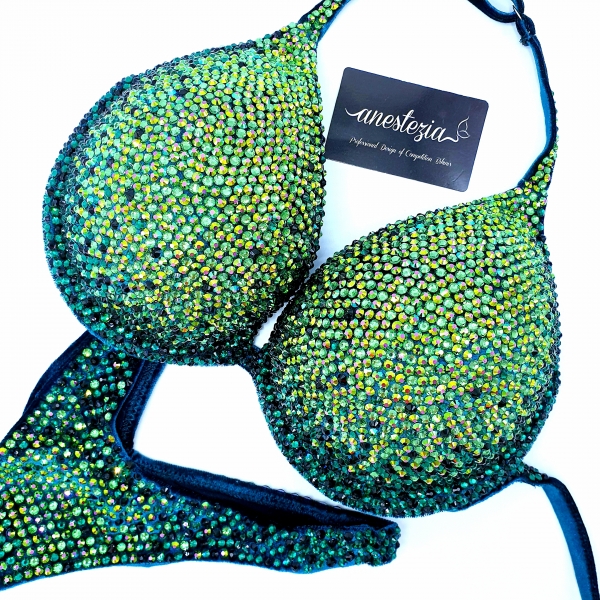 Increíble bikini de Peacock Paradise es uno de nuestros nuevos diseños con braguita estilo Ruso. Decoración gradual de cristales verdes hacen un hermoso efecto visual. Braguita de estilo ruso y sujetador copa con aro. Este bikini es ideal para competidoras de nivel nacional e internacional.