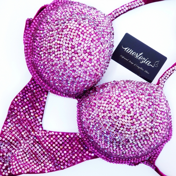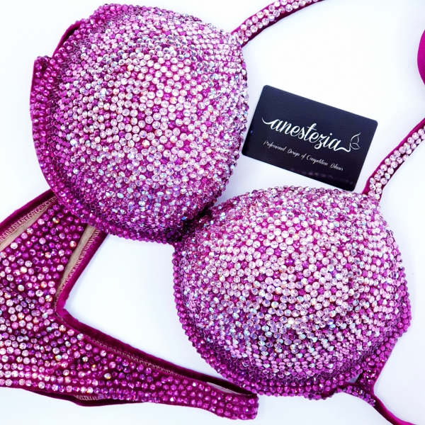 Increíble bikini de Pink Moon es uno de nuestros nuevos diseños con braguita estilo Ruso. Gradual de 2 tonos de cristales color rosa hacen un hermoso efecto visual. Terciopelo rosa oscuro. Braguita de estilo ruso y sujetador copa con aro. Este bikini es ideal para competidoras nivel internacional.