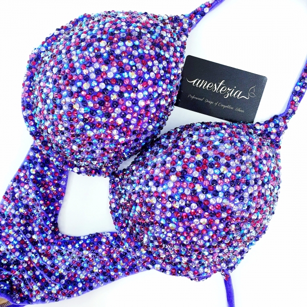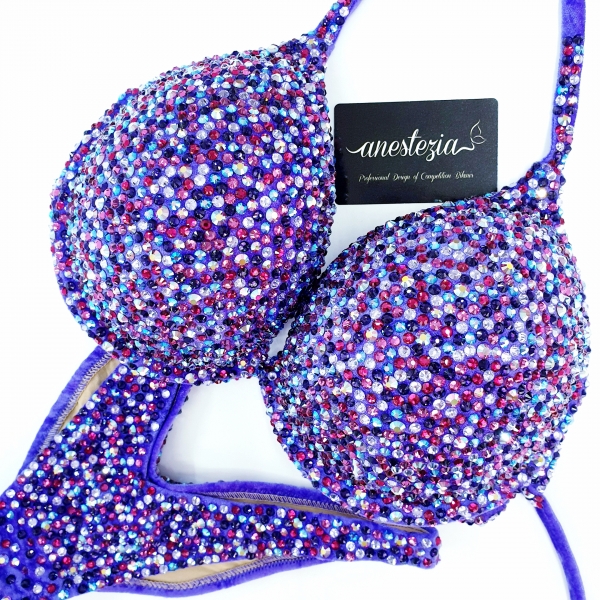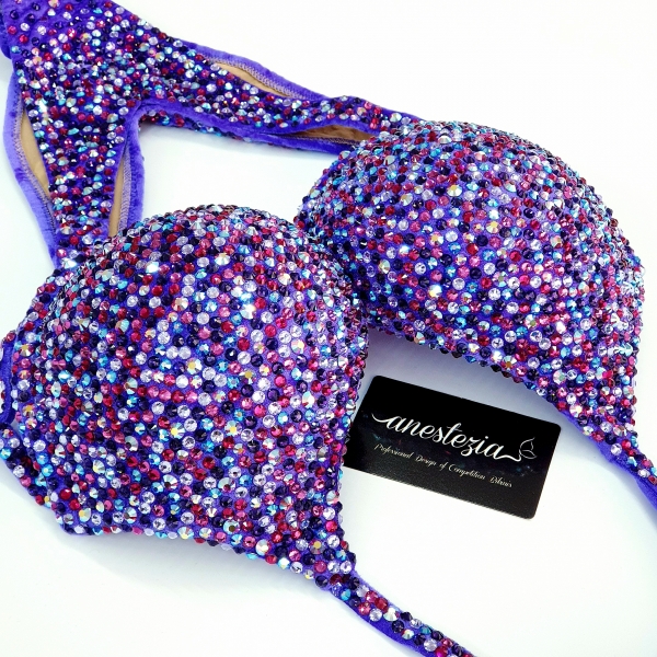 Increíble bikini Pretty Woman es uno de nuestros bikinis línea de lujo. Mix de 6 colores cubren totalmente la tela. Elegante terciopelo violeta. Sujetador con aros y braguita de estilo ruso. Este bikini es ideal para competidoras de nivel nacional e internacional.
