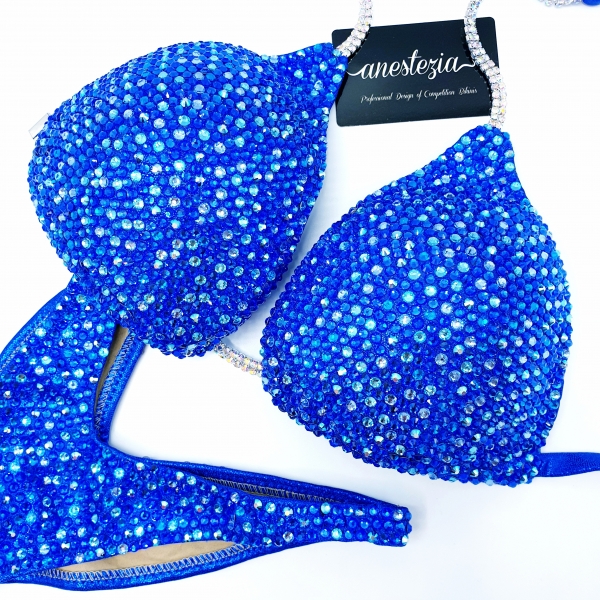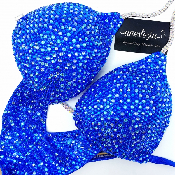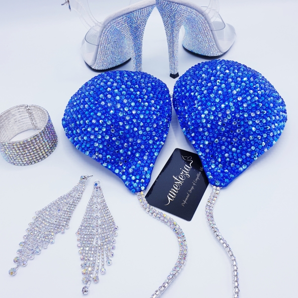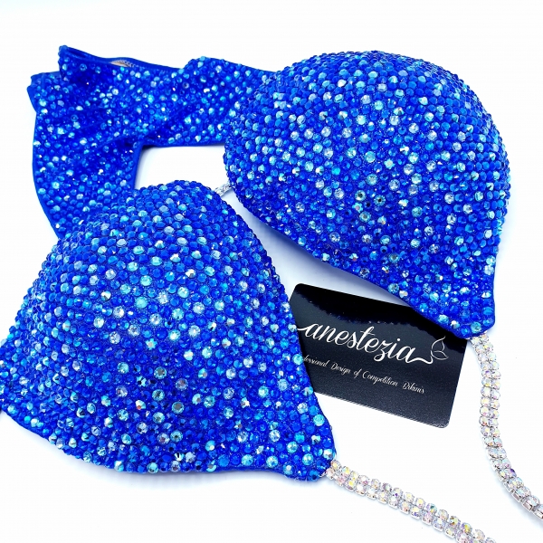 Briliante bikini Royal Beauty es una de nuestros espectaculares bikinis de lujo total en cristales. Tela royal blue cubierto con cristales de diferentes tonos de azul. Luce brillante y elegante en el escenario. Ideal para atletas rubias o morenas.