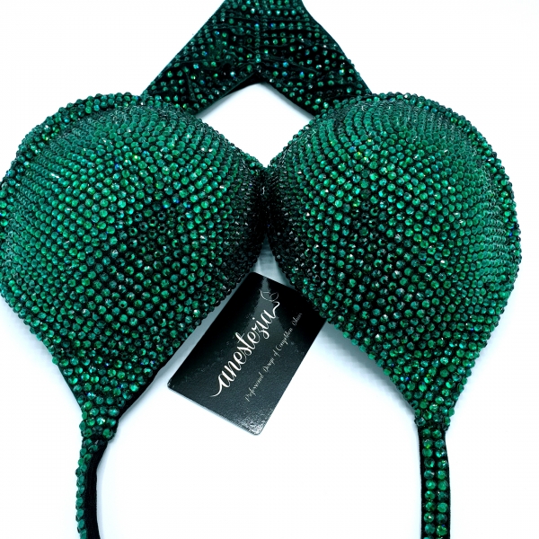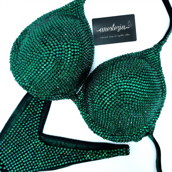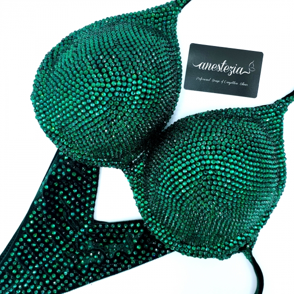 Magnífica bikini fitness Green Queen totalmente cubierto de cristales Te hará brillar increíblemente en el escenario. Perfecto tanto para atletas con pelo rubio o de pelo oscuro .