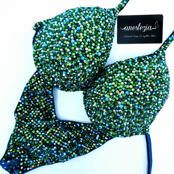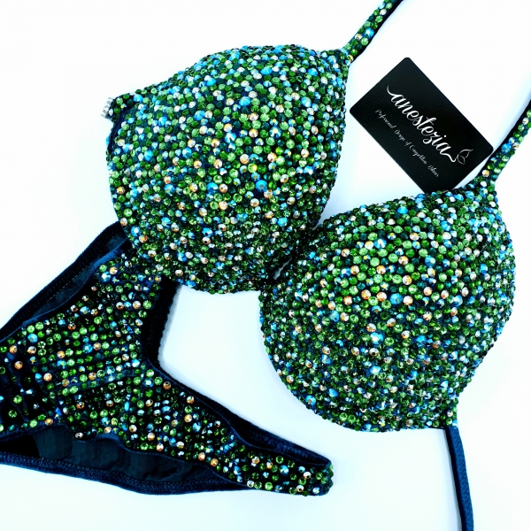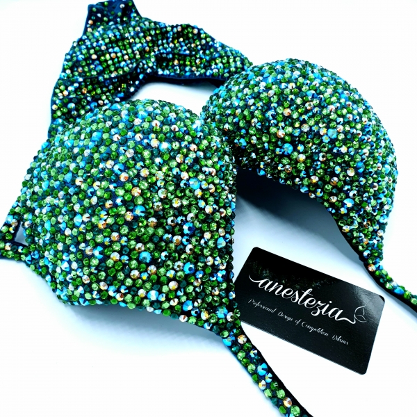 Increíble bikini Fresh Dream es uno de nuestros bikinis línea de lujo. Mezcla de cristales verdes cubren totalmente la tela de un elegante terciopelo Sujetador copa con aros y braguita de estilo ruso. Este bikini es ideal para competidoras de nivel internacional.