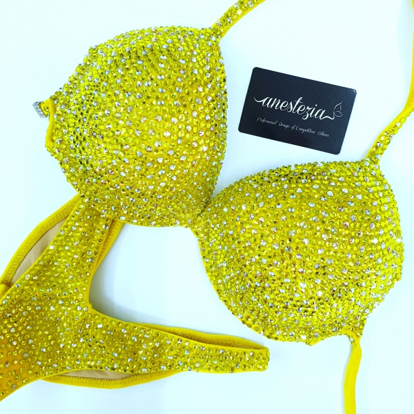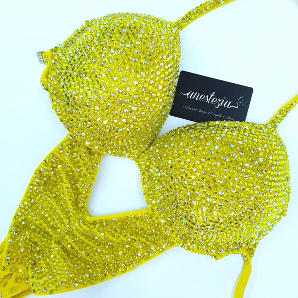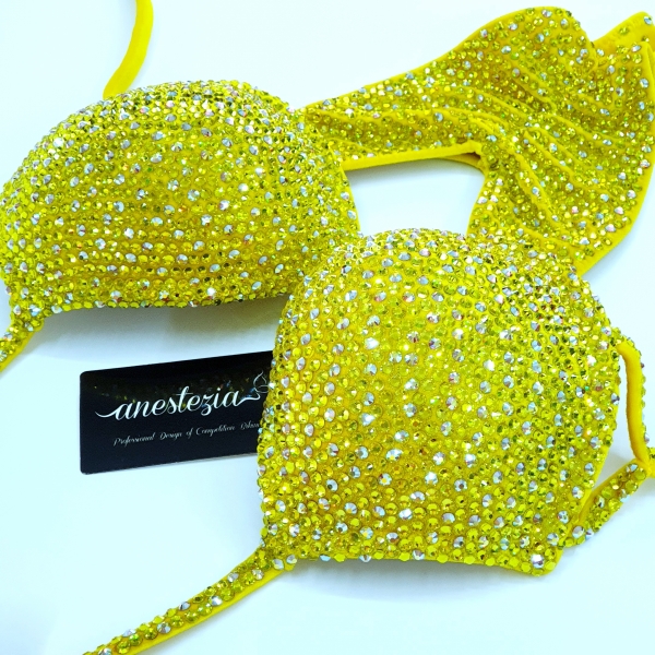 Briliante bikini Sunny Day es uno de nuestros espectaculares bikinis de lujo total en cristales. Tela de terciopelo color amarillo cubierto totalmente en cristales de 2 colores.