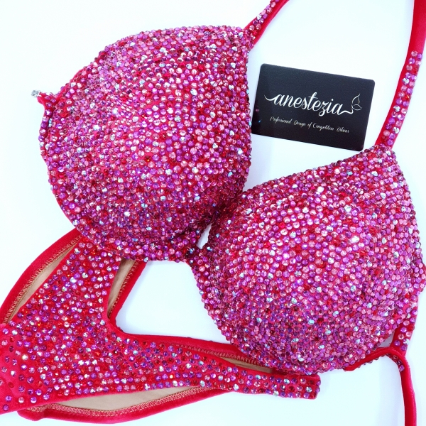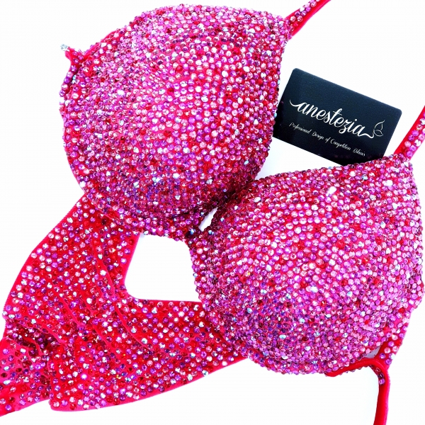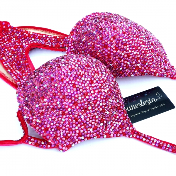Increíble bikini Berry Cheescake es uno de nuestros bikinis línea de lujo. Mix de diferentes tonos de cristales rosa cubren totalmente le elegante tela de terciopelo. Sujetador con aros y braguita de estilo ruso. Este bikini es ideal para competidoras de nivel nacional e internacional.