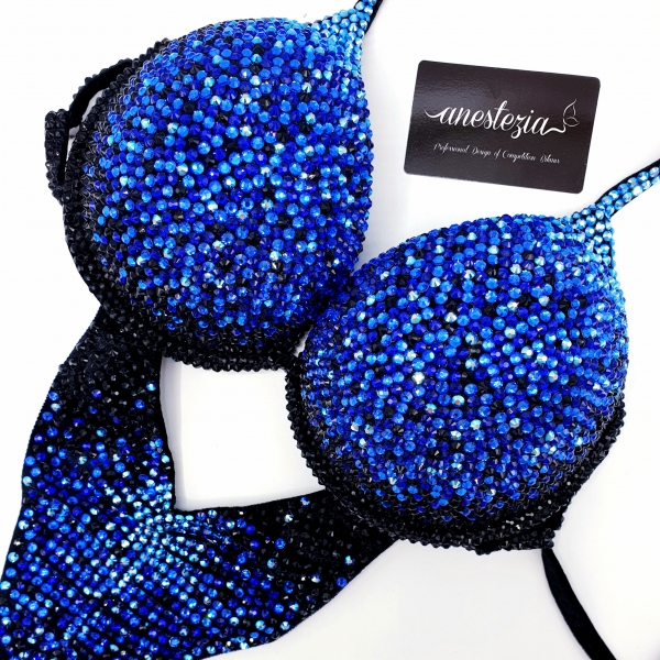 Increíble bikini de Sweet Indigo es uno de nuestros bikinis línea de lujo. Gradual de 4 colores cubren totalmente la tela. Elegante terciopelo negro. Sujetador copa con aro y braguita estilo ruso. Este bikini es ideal para competiciones nacionales e internacional.