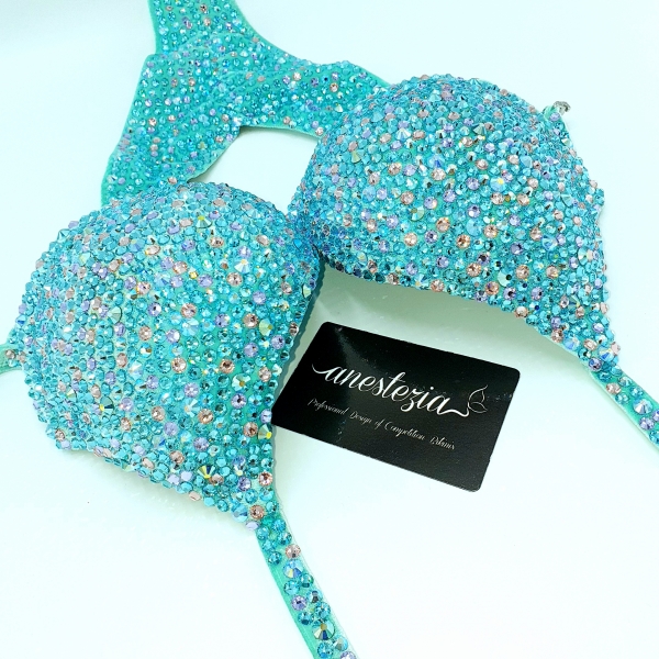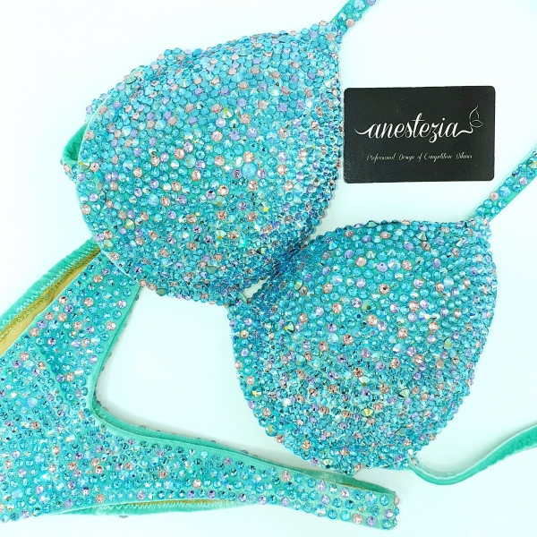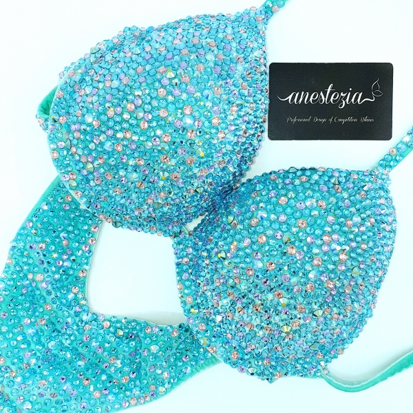 Increíble bikini Mint Iceland es uno de nuestros bikinis línea de lujo. Mix de 6 colores cubren totalmente la tela de terciopelo. Sujetador copa con aros y braga de estilo ruso. Este bikini es ideal para competiciones nacionales e internacionales.