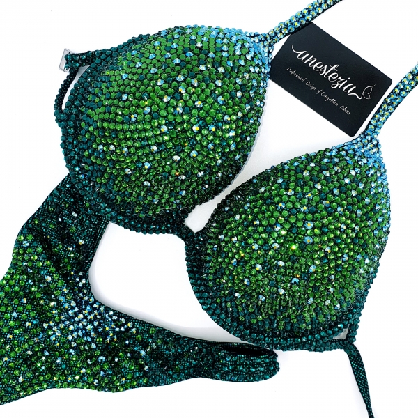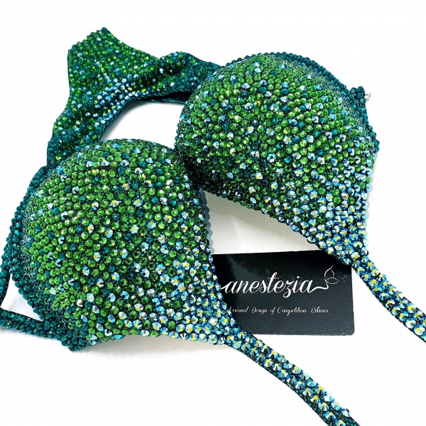 Increíble bikini de Peacock Fantasy es uno de nuestros nuevos diseños con braguita estilo Ruso. Decoración gradual de cristales verdes hacen un hermoso efecto visual. Braguita de estilo ruso y sujetador copa con aro. Este bikini es ideal para competidoras de nivel nacional e internacional.