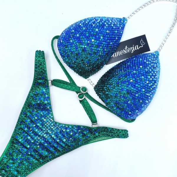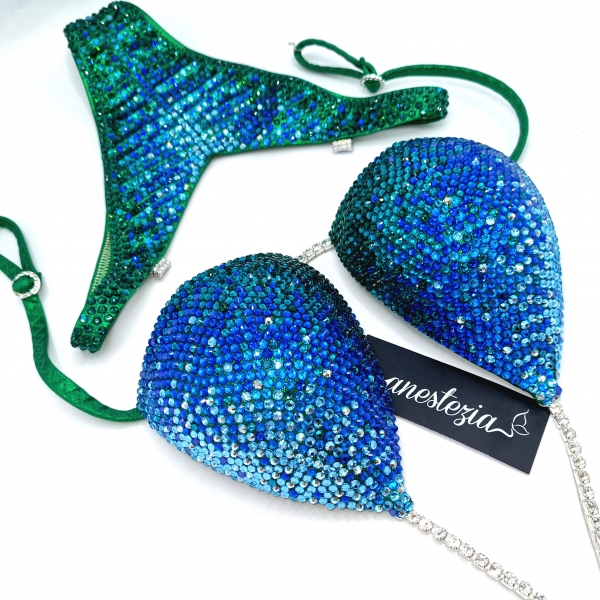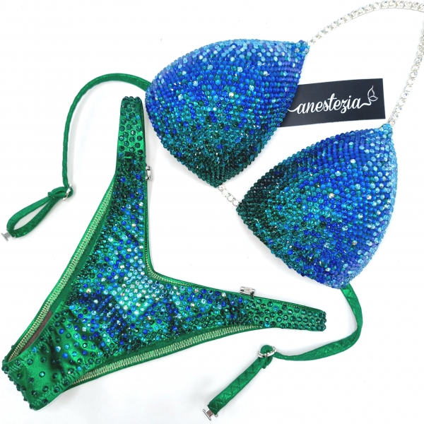 Magnífico Dragon Eyes Body fitness Posing suit totalmente cubierto de cristales con diferentes tonos. Con este posing suit brillarás como un diamante en la tarima.