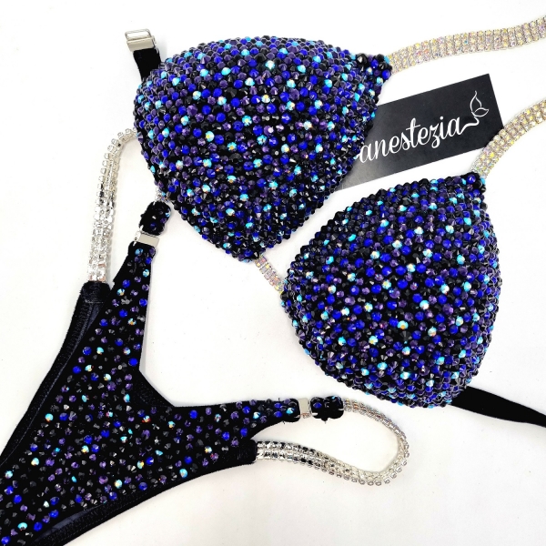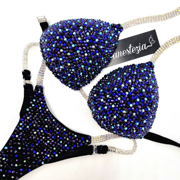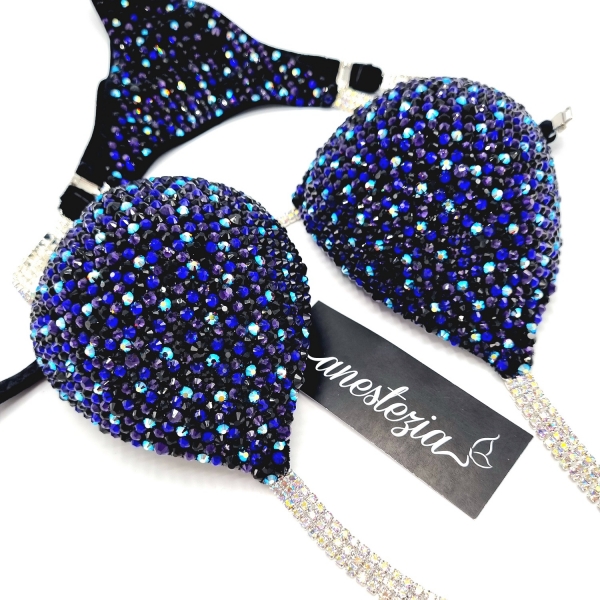 Increíble bikini Darkest Night es uno de nuestros nuevos diseños decorado con cristales. Mix de varios tonos de cristales cubren totalmente la tela. Este bikini es ideal para competidoras de nivel nacional e internacional, luce magnífica con tu tono de piel.
