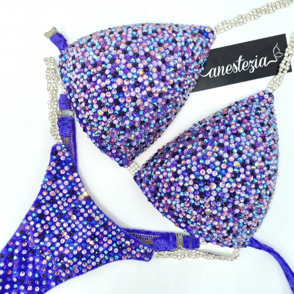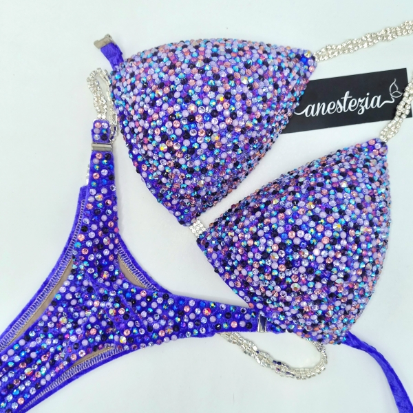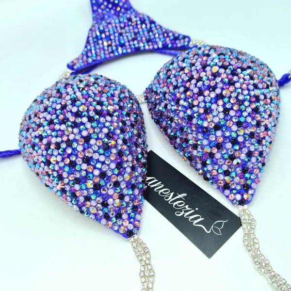 Increíble bikini de Violet Lagoon es uno de nuestros nuevos diseños decorado totalmente con cristales. Mix de varios tonos de cristales cubren totalmente la tela. Este bikini es ideal para competidoras de nivel nacional e internacional, luce magnífica con tu tono de piel.
