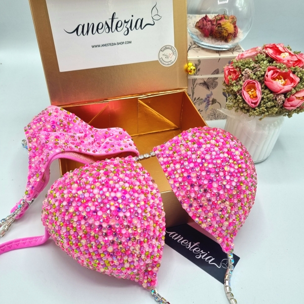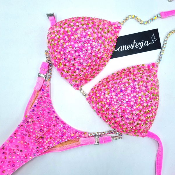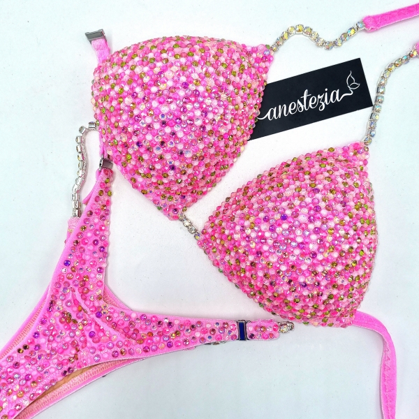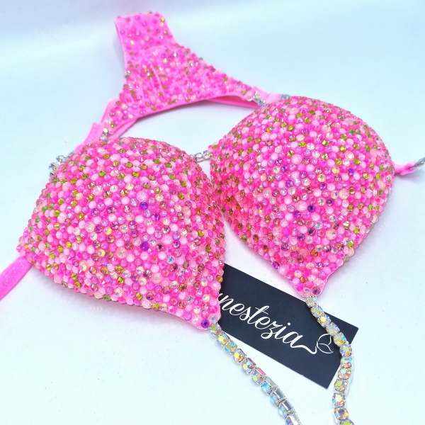 Increíble bikini de Pink Bubblegum es uno de nuestros nuevos diseños decorado totalmente con cristales. Mix de varios tonos de cristales cubren totalmente la tela. Este bikini es ideal para competidoras de nivel nacional e internacional, luce magnífica con tu tono de piel.