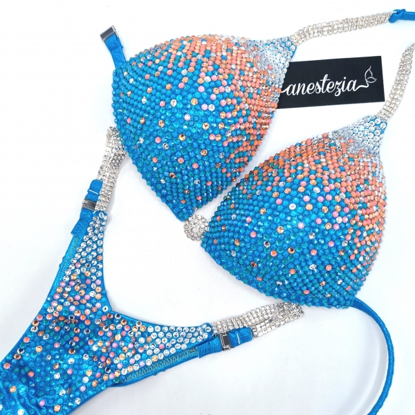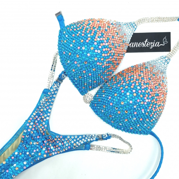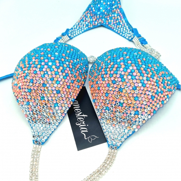 Increíble bikini de Peach Icecream es uno de nuestros nuevos diseños decorado totalmente con cristales. Mix de varios tonos de cristales cubren totalmente la tela. Este bikini es ideal para competidoras de nivel nacional e internacional, luce magnífica con tu tono de piel.