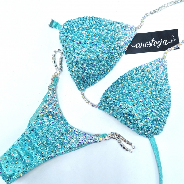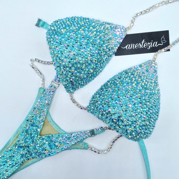 Increíble bikini Tender Mint es uno de nuestros nuevos diseños decorado totalmente con cristales. Mix de varios tonos de cristales cubren totalmente la tela. Este bikini es ideal para competidoras de nivel nacional e internacional.