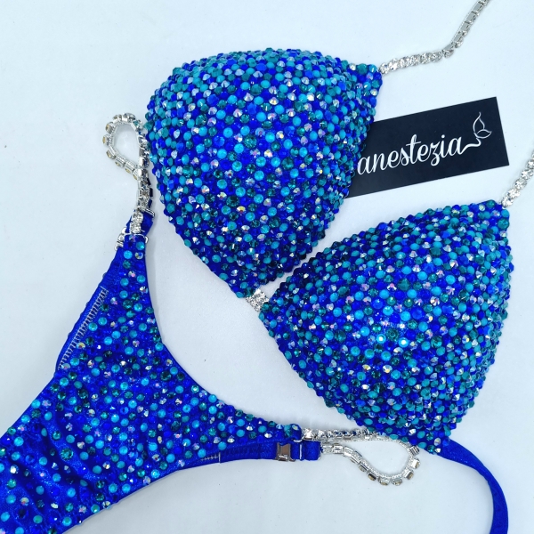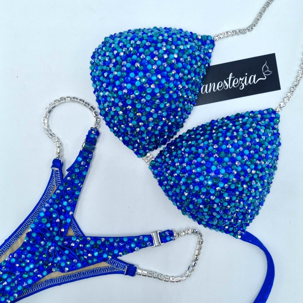 Increíble bikini Deep Lagoon es uno de nuestros nuevos diseños decorado totalmente con cristales. Mix de varios tonos de cristales cubren totalmente la tela. Este bikini es ideal para competidoras de nivel nacional e internacional.