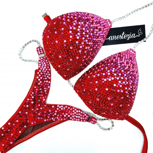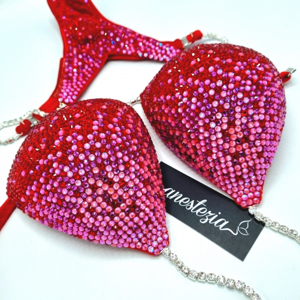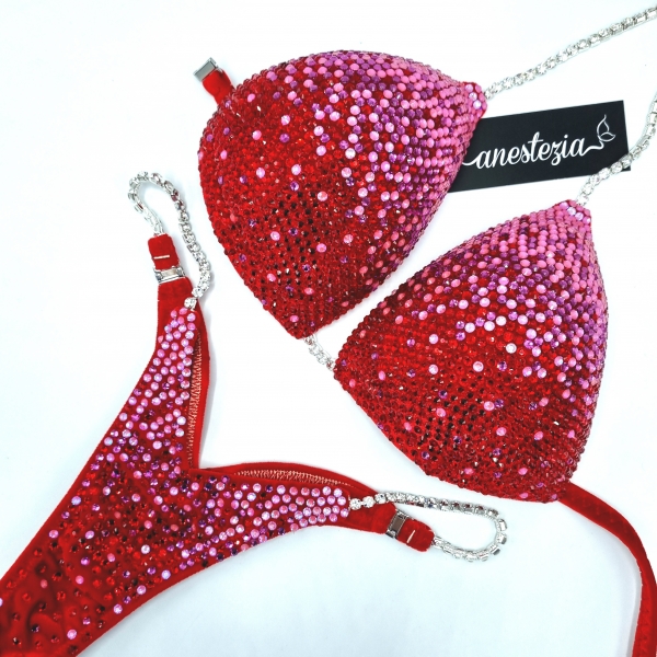 Increíble bikini Rose Blossom es uno de nuestros nuevos diseños decorado totalmente con cristales. Mix de varios tonos de cristales cubren totalmente la tela de terciopelo.. Este bikini es ideal para competidoras de nivel nacional e internacional.