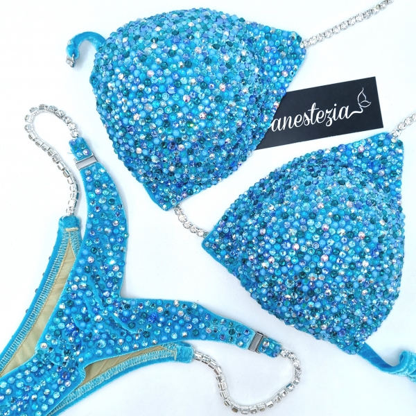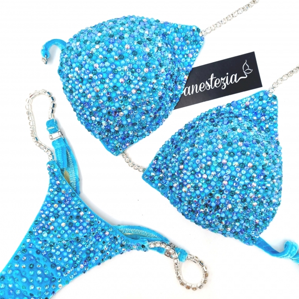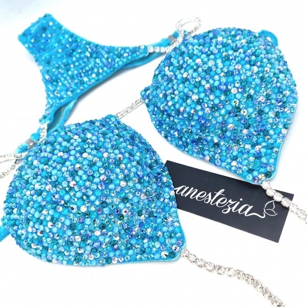 Increíble bikini Frosted Lake es uno de nuestros nuevos diseños decorado totalmente con cristales. Mix de varios tonos de cristales cubren totalmente la tela. Este bikini es ideal para competidoras de nivel nacional e internacional.