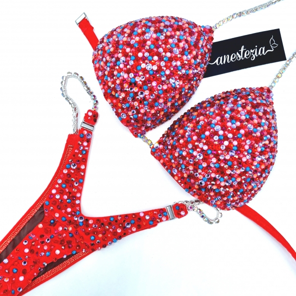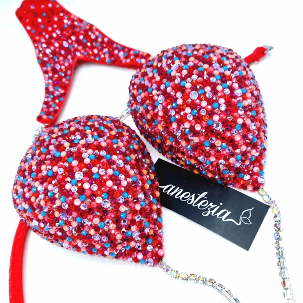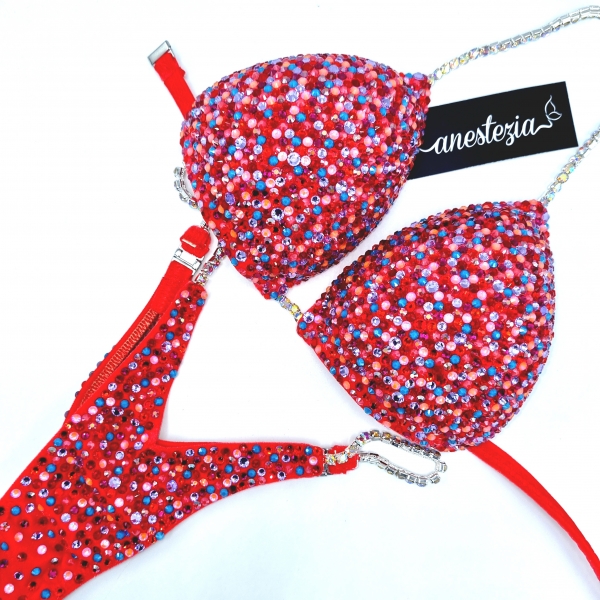 Increíble Rocking Red es uno de nuestros nuevos diseños decorado totalmente con cristales. Mix de varios tonos de cristales cubren totalmente la tela. Este bikini es ideal para competidoras de nivel nacional e internacional.