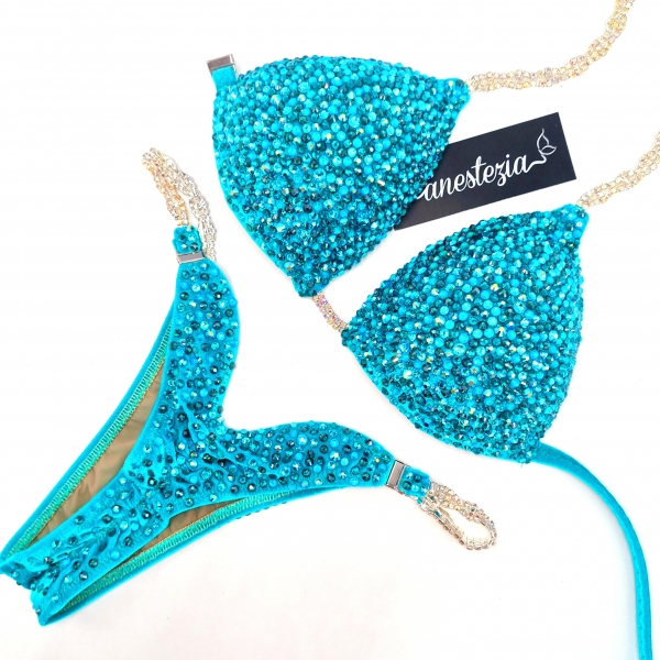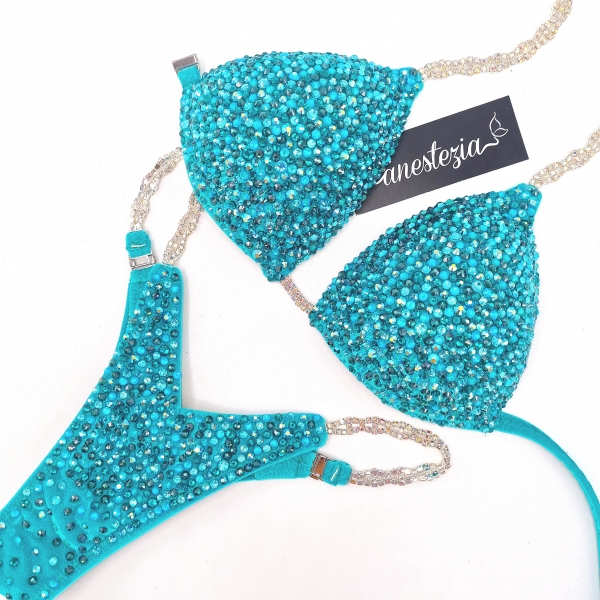Increíble bikini Tiffany Ocean es uno de nuestros nuevos diseños decorado totalmente con cristales. Mix de varios tonos de cristales cubren totalmente la tela. Este bikini es ideal para competidoras de nivel nacional e internacional.