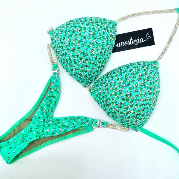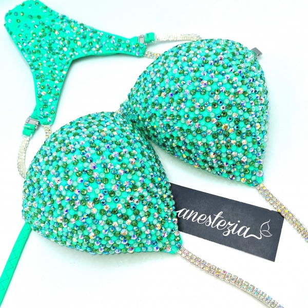 Increíble bikini Mint Obsession es uno de nuestros nuevos diseños decorado con cristales. Mix de varios tonos de cristales cubren totalmente la tela. Este bikini es ideal para competidoras de nivel nacional e internacional, luce magnífica con tu tono de piel.