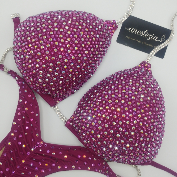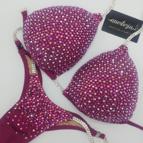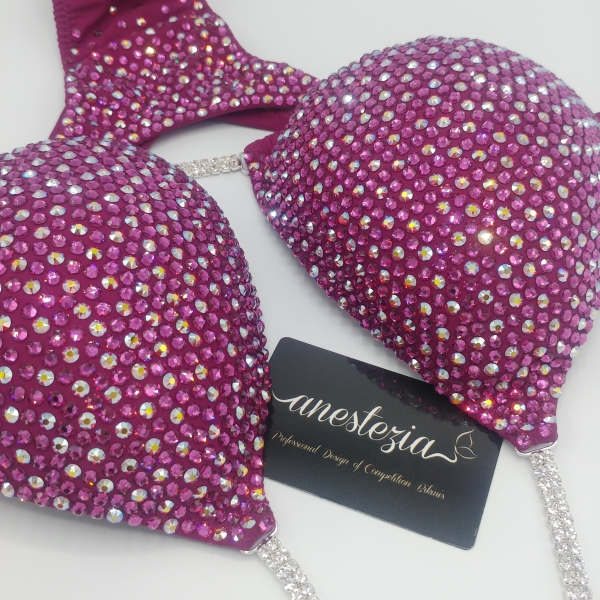 Briliante bikini Raspberry Dream es una de nuestras espectaculares bikinis total cristales. Tela de terciopelo color Frambuesa cubierto totalmente en cristales de 2 colores. Este bikini brilla como un diamante en el escenario.