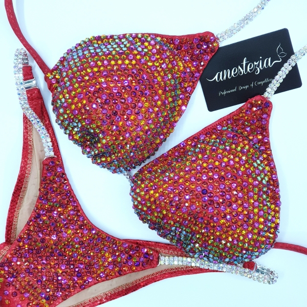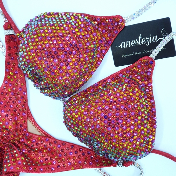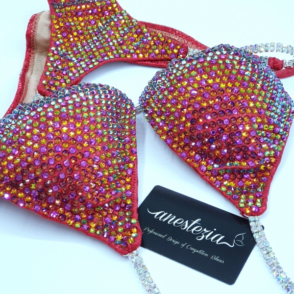 Magnífico bikini Red Chameleon hecho para lucirlo en el escenario y brilles como una estrella. Es unos de nuestros diseños camaleónicos con cristales que cambian de color mientras te encuentras en movimiento. Perfecto para atletas de rubias o morenas.