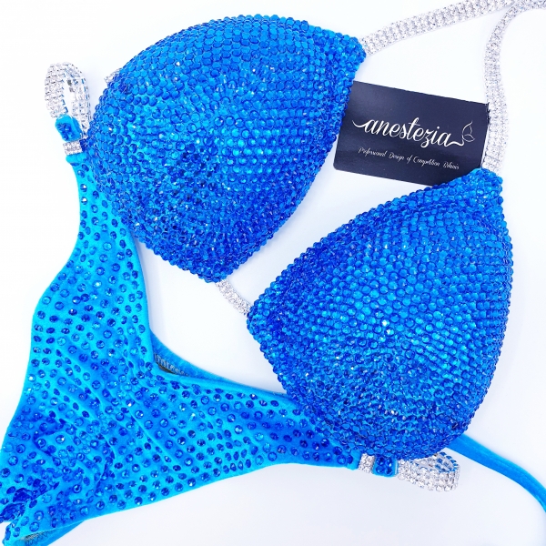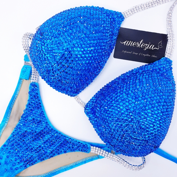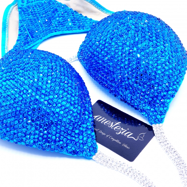 Magnífico bikini fitness Pure Sky totalmente cubierto de cristales Te hará brillar increíblemente en el escenario. Muy elegante bikini clásico estilo Pro. Perfecto tanto para atletas con pelo rubio o de pelo oscuro .