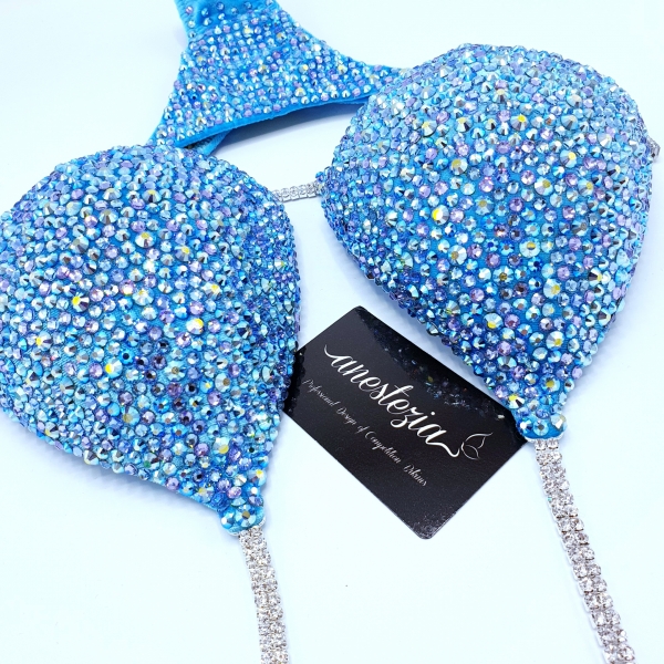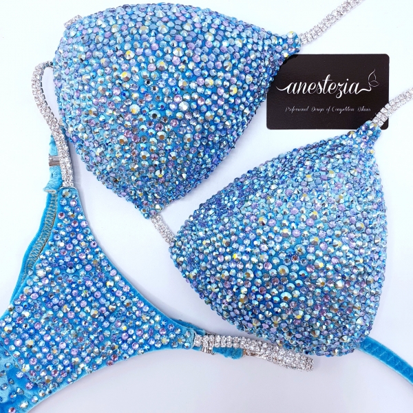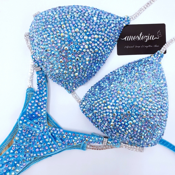 Magnífico bikini Clear Sky es el bikini de la campeona Isa Picini en el Campeonato de Olimpia 2019. Elegante terciopelo totalmente decorado con un único mix de cristales. Perfecto para atletas rubias o morenas