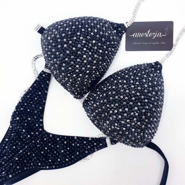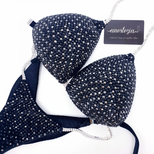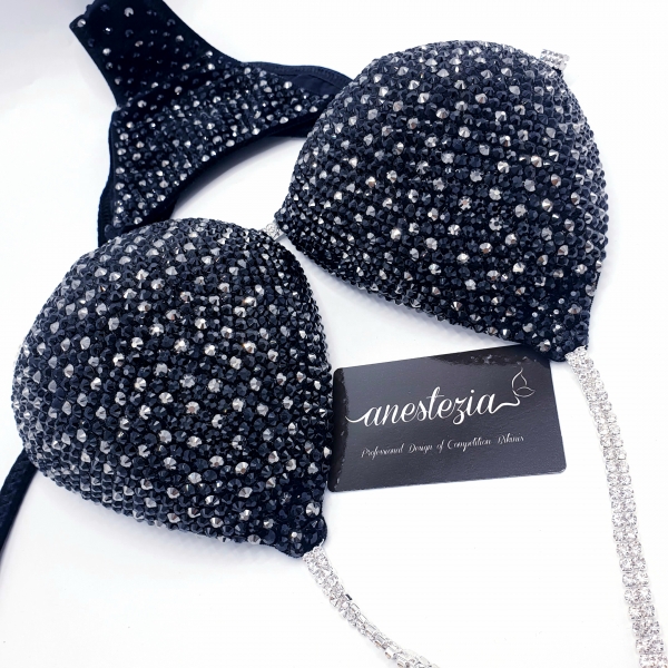 Brillante bikini Full Moon PRO es una de nuestros espectaculares bikinis de lujo total en cristales. Tela de terciopelo color negro cubierto totalmente en cristales de 2 tonos de negro.
