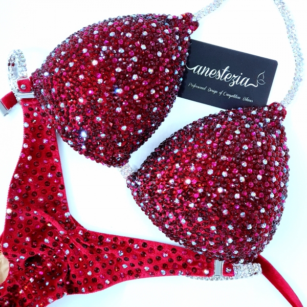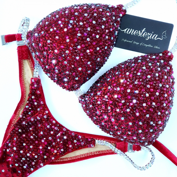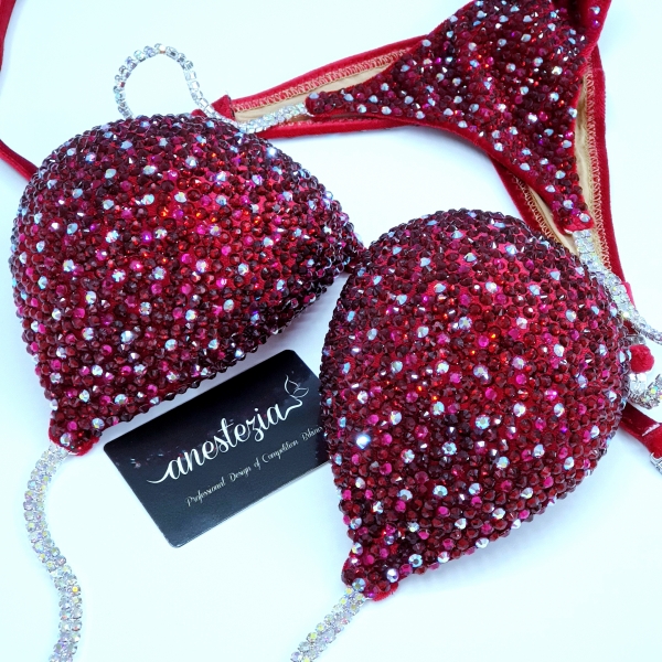 Brillante bikini Spanish Wine es una de nuestras espectaculares bikinis total cristales. Tela de terciopelo color rojo oscuro cubierto totalmente en cristales. Ideal para Atletas con cabello rubio y moreno.