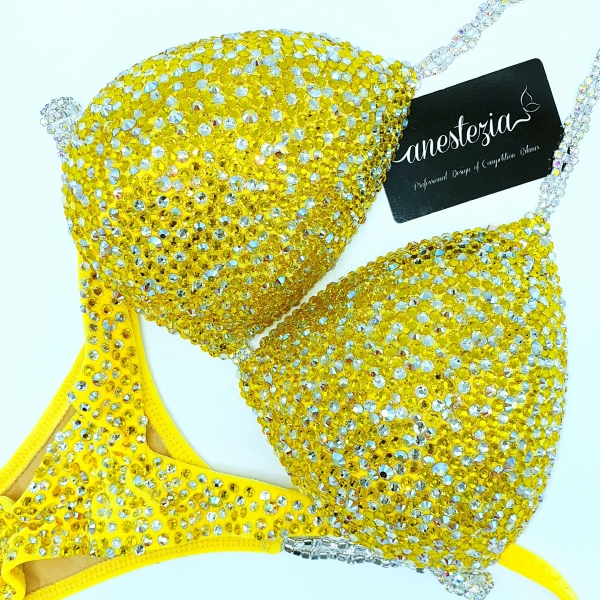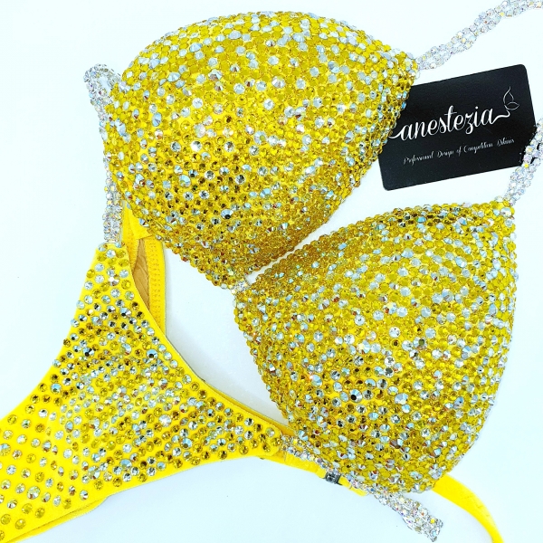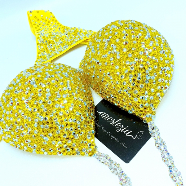 Briliante bikini Sunny Angel  es uno de nuestros espectaculares bikinis de lujo total en cristales. Tela de terciopelo color amarillo brillante .