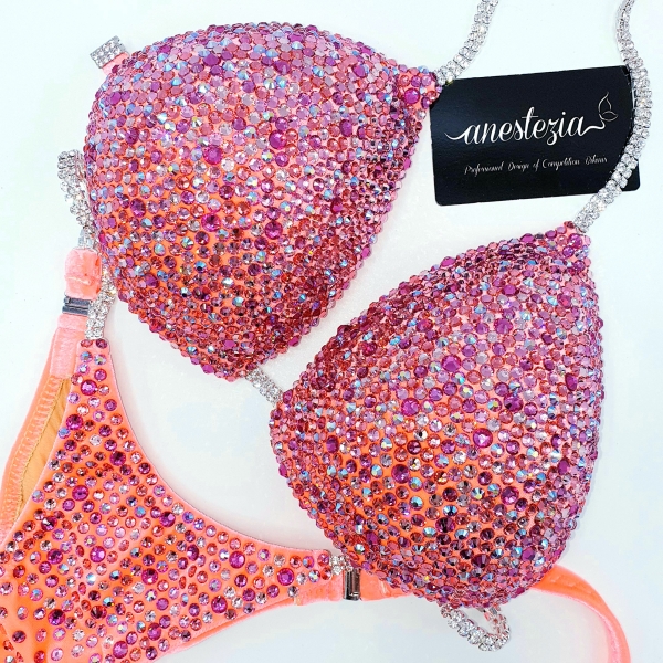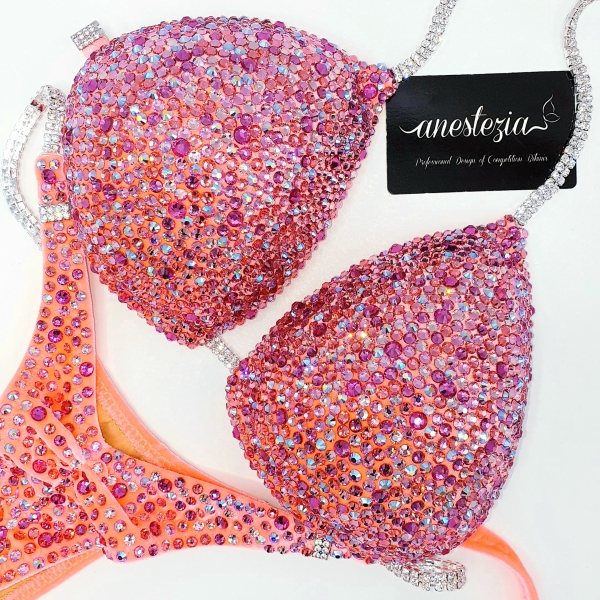 Increíble bikini Juicy Peach es uno de nuestros bikinis línea de lujo. Mix de diferentes tonos de colores melocotón cubren totalmente la tela. Combinación de diferentes tamaños de cristales. Sujetador triangulo y braguita de estilo americano. Este bikini es ideal para atletas con cabello rubio u oscuro.