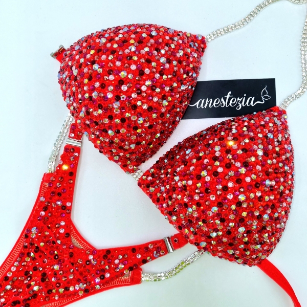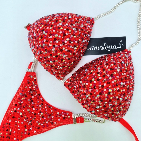 Brillante bikini American Volcan es uno de nuestros espectaculares bikinis total cristales. Tela de color Rojo Ferrari cubierto totalmente en cristales de varios tonos rojos. Este bikini brilla como un diamante en el escenario.