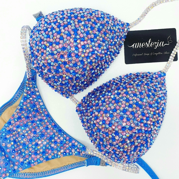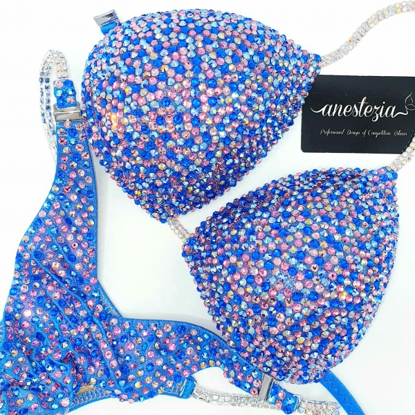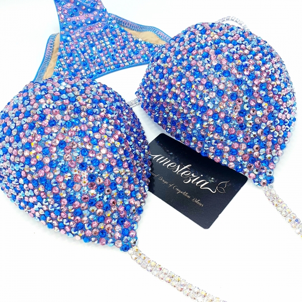 Brillante bikini Caramel Sky es uno de nuestros espectaculares bikinis total cristales. Hermosa combinación de cristales de Azul turquesa y rosas lo hacen muy inusual y brillante. Este bikini brilla como un diamante en el escenario.