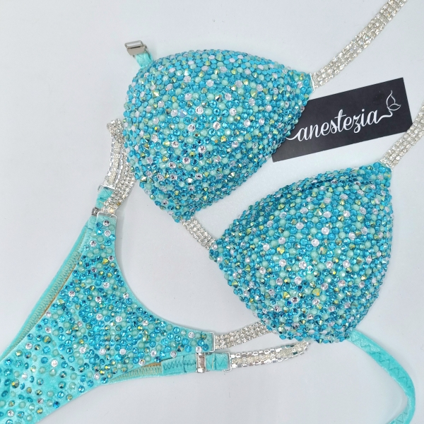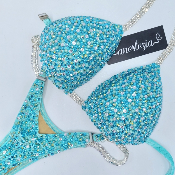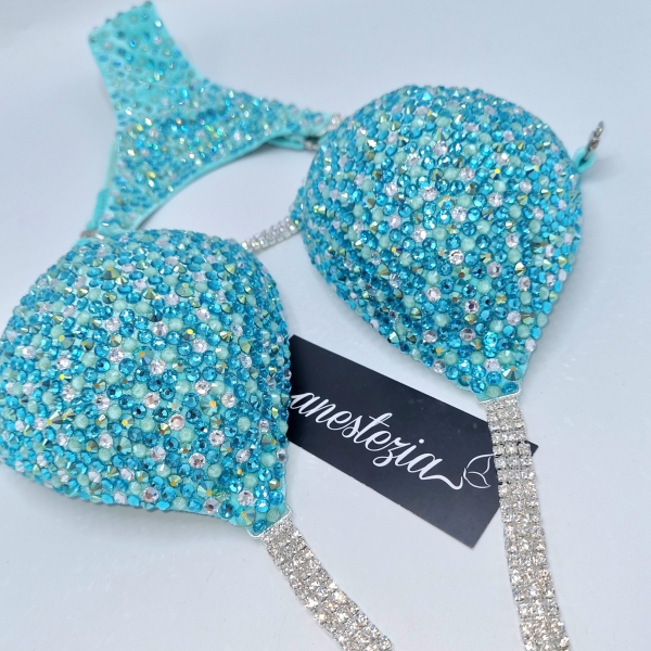 Increíble bikini de Mint Sorbeth es uno de nuestros nuevos diseños decorado con cristales. Mix de varios tonos de cristales cubren totalmente la tela. Este bikini es ideal para competidoras de nivel nacional e internacional, luce magnífica con tu tono de piel. Cada Bikini está hecho a la medida del cliente. Eres libre de elegir el corte, estilo, conectores y la categoría de competencia de nuestra lista.