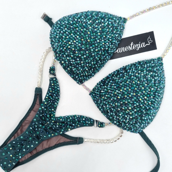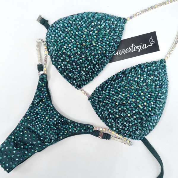 Increíble bikini Green Mist es uno de nuestros nuevos diseños decorado con cristales. Mix de varios tonos de cristales cubren totalmente la tela. Este bikini es ideal para competidoras de nivel nacional e internacional, luce magnífica con tu tono de piel.