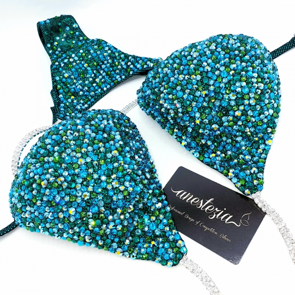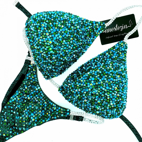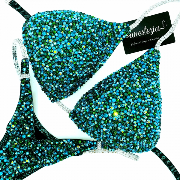 Increíble bikini Green Olympia es uno de nuestros bikinis línea de lujo. Mix de 6 tonos de colores verdes cubren totalmente la tela. Este bikini es ideal para atletas con cabello rubio u oscuro.